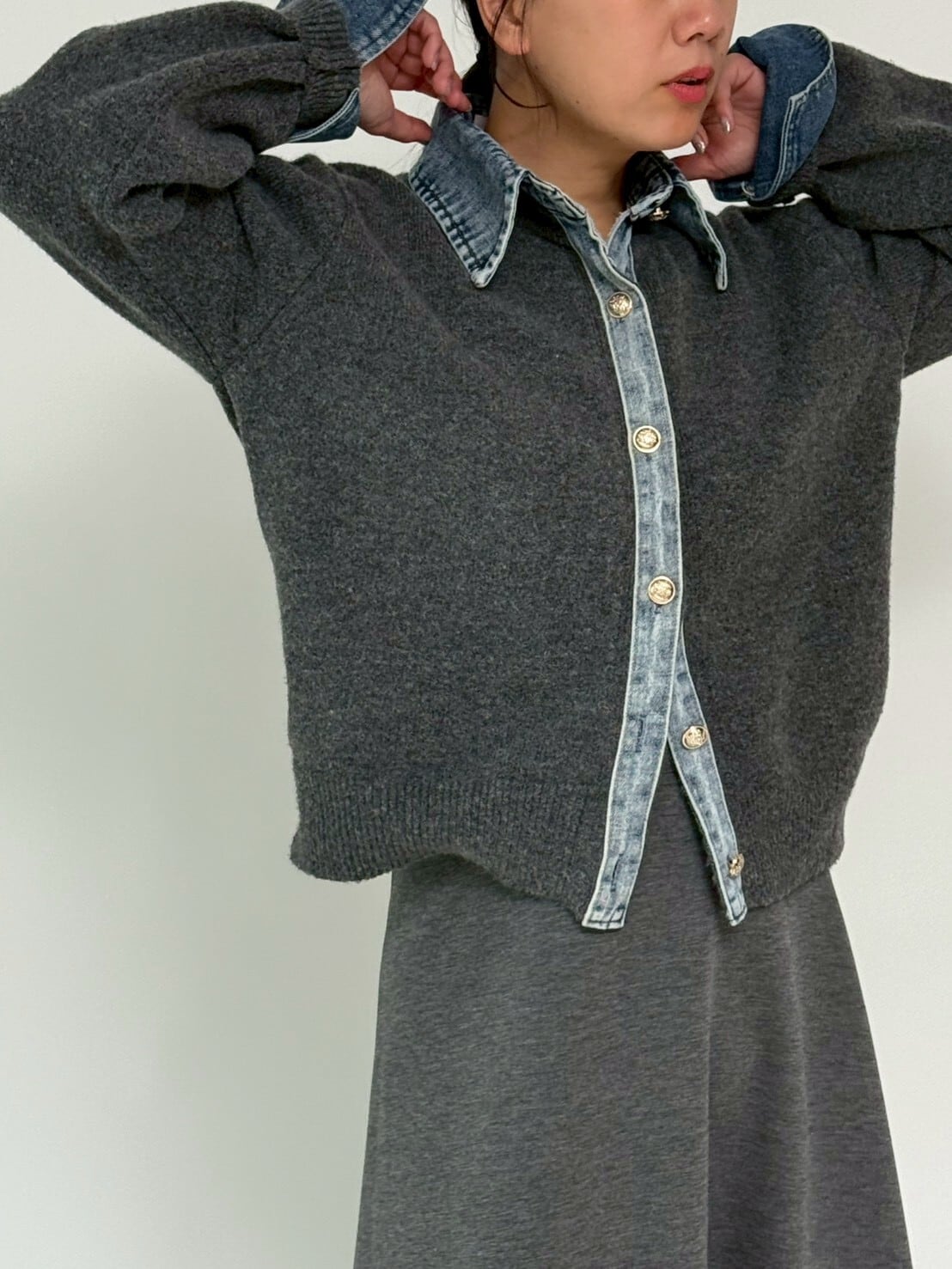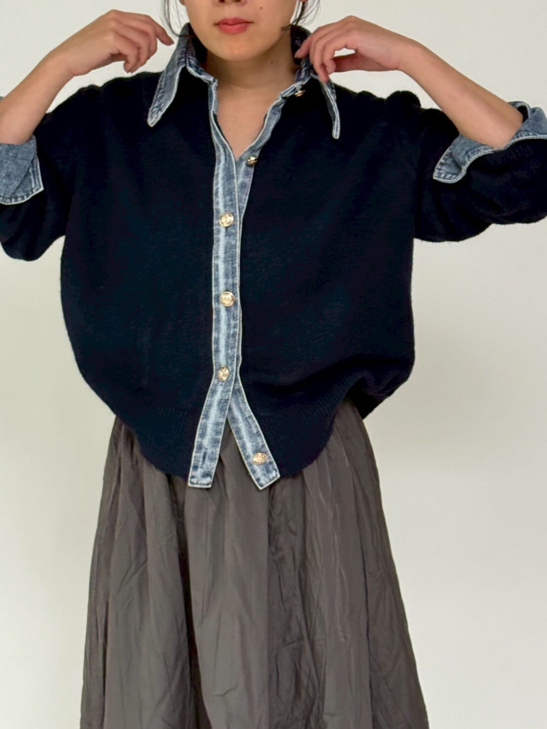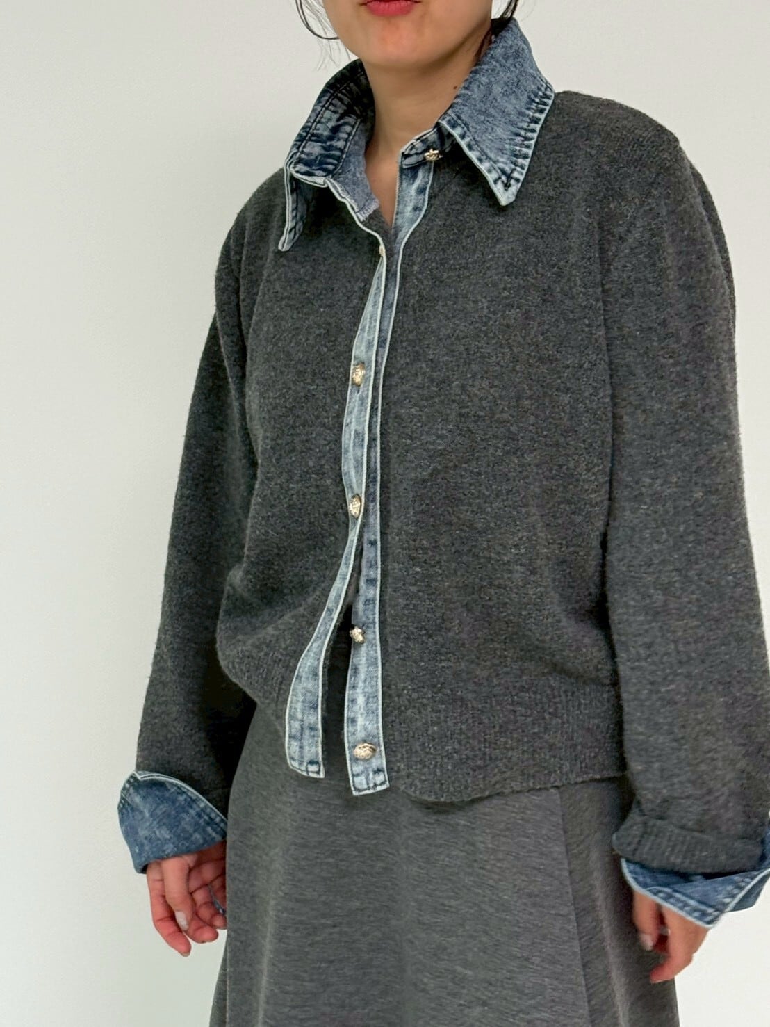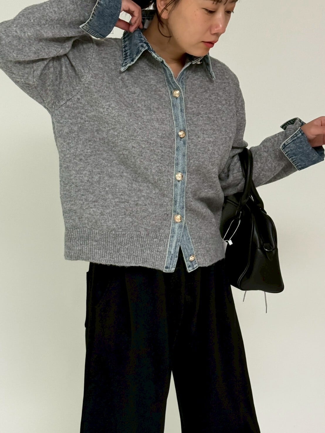 デニム×ニットの異素材切替デザインが、個性的なカーディガンです。