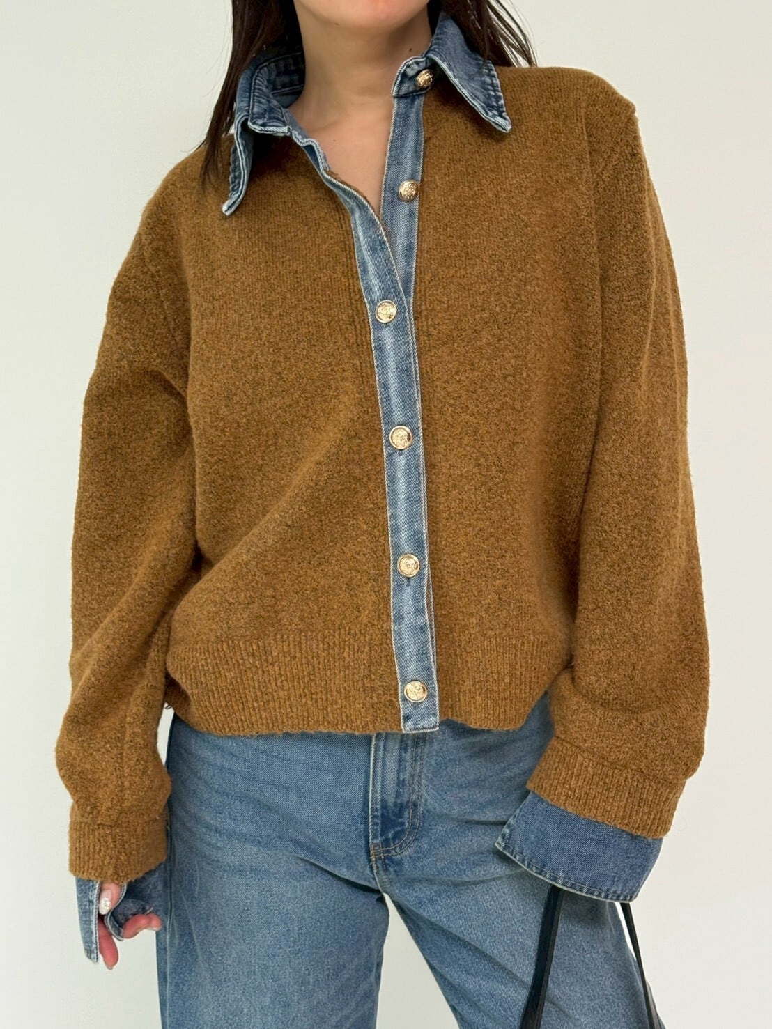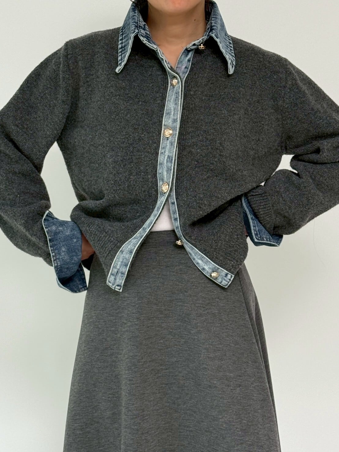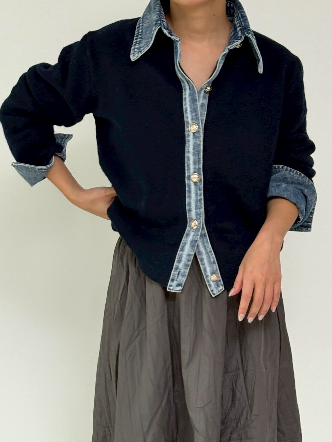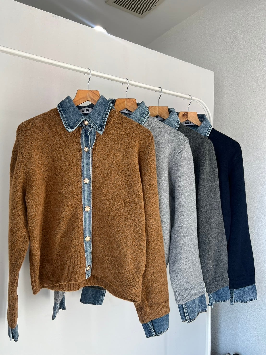 デニム×ニットの異素材切替デザインが、個性的なカーディガンです。