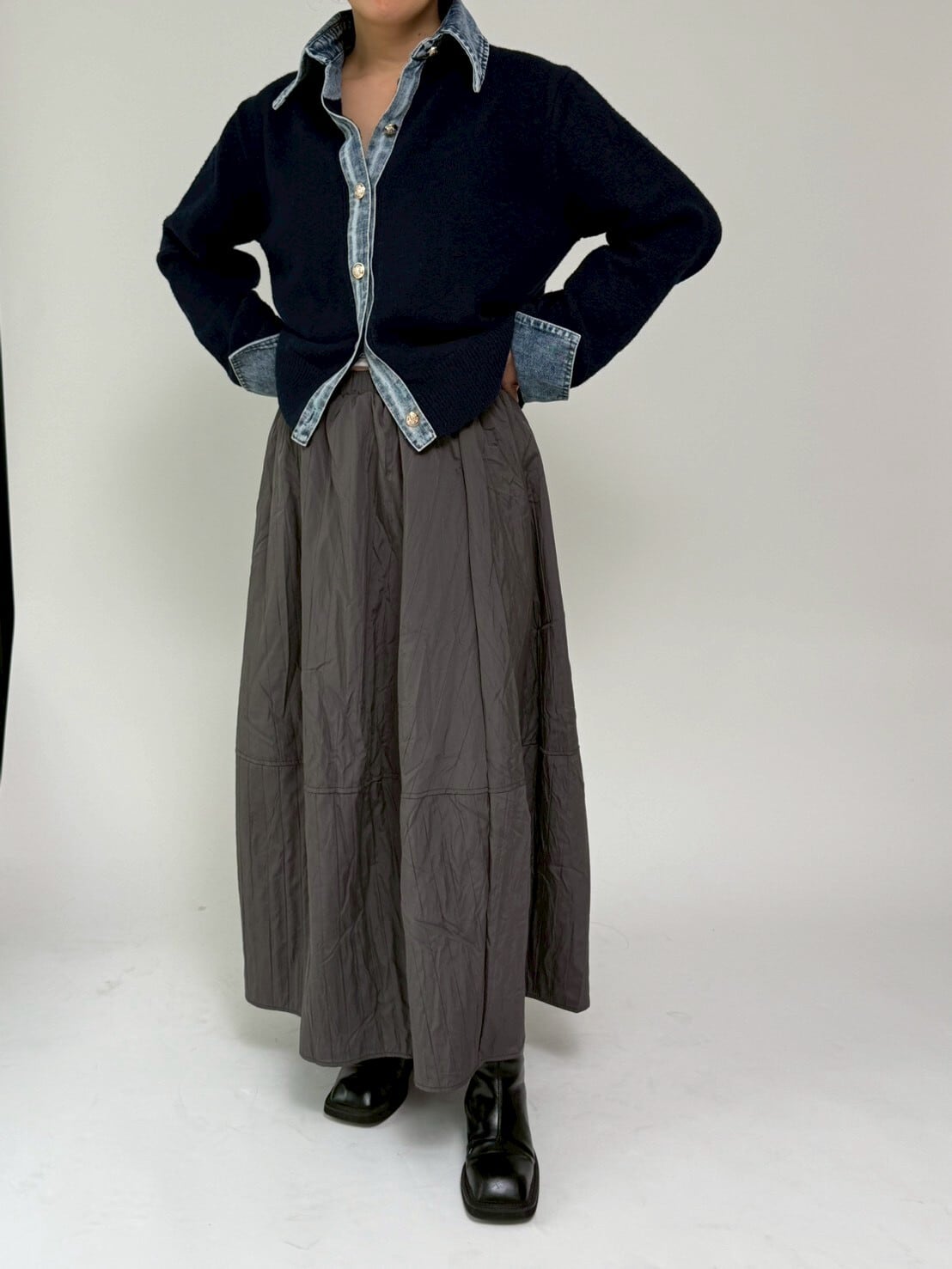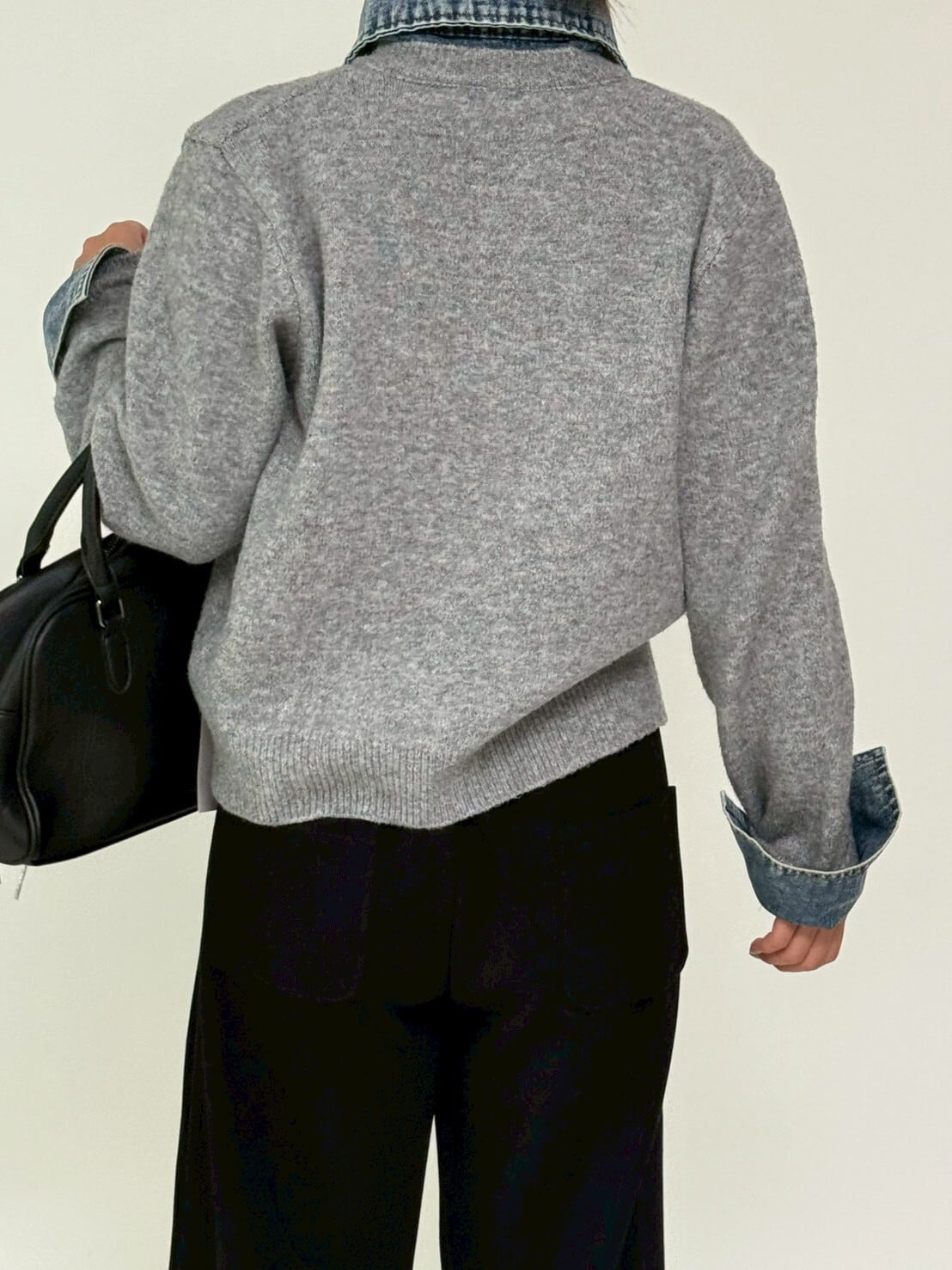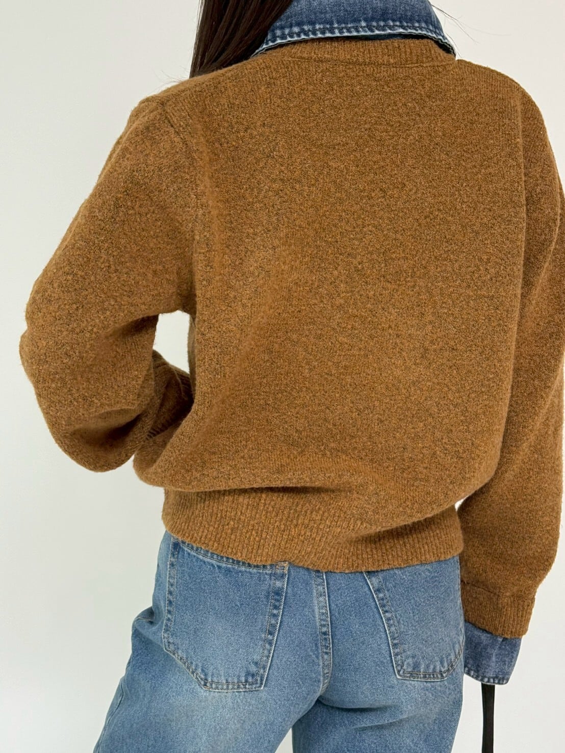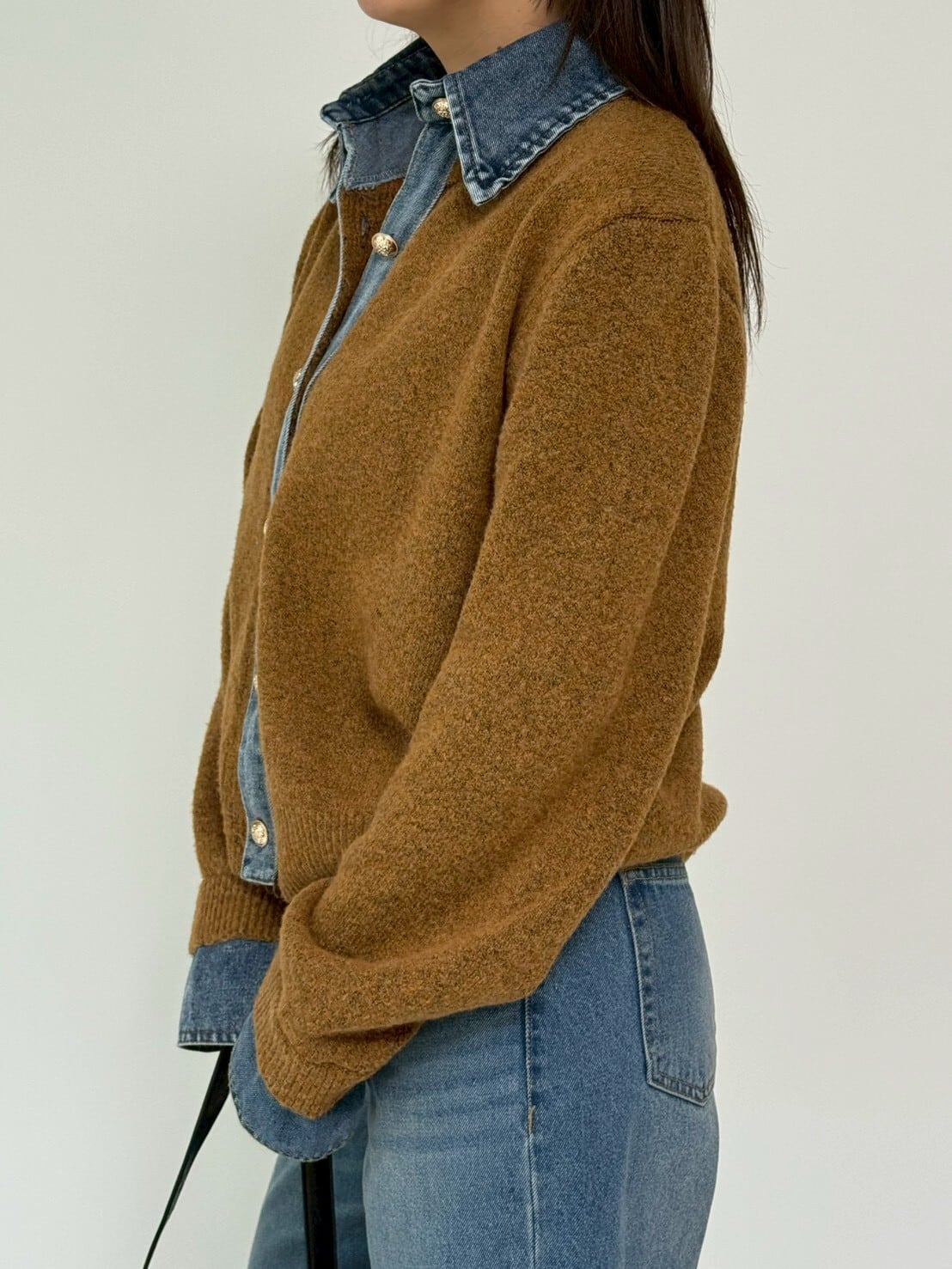 デニム×ニットの異素材切替デザインが、個性的なカーディガンです。